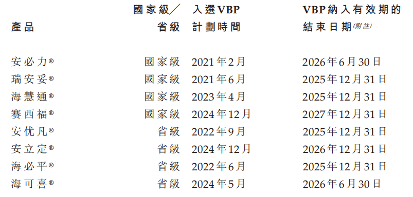 此外,海西新药还有另外4款纳入省级VBP计划的产品,最晚将于2026年6月30日到期。
