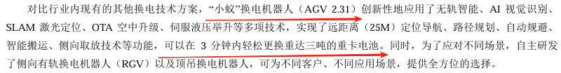 对比行业内现有的其他换电技术方案,“小蚁”换电机器人创新性地应用了无轨智能、AI视觉识别、SLAM激光定位、OTA空中升级、伺服液压举升等多项技术,实现了远距离(25M)定位导航、路径规划、自动规避、智能搬运、侧向取放技术等功能,可以在3分钟内轻松更换重达3吨的重卡电池。