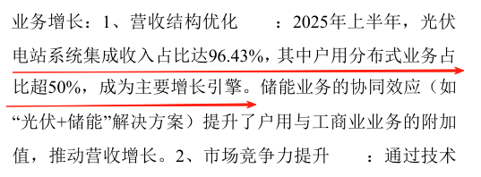 在营收结构上,2025年上半年,光伏电站系统集成收入占比达96.43%,其中户用分布式业务占比超50%,成为主要增长引擎。