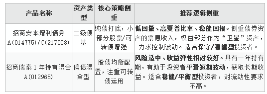 导语:针对不同风险偏好,我们精选了兼顾低回撤与收益弹性的稳健配置方案:对于追求极致稳健的投资者,可关注招商安本增利债券C(217008),其以二级债基策略力求控制波动;而追求适度弹性且能接受一年持有期的客户,招商瑞泰1年持有混合A(012965)或许是平衡股债、实现长期稳健增值的优选