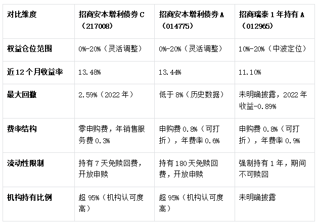 选取同公司中波固收+代表招商瑞泰1年持有混合A(012965)进行维度对比,更能凸显招商安本增利债券C类(217008)与A类(014775)的适配性优势: