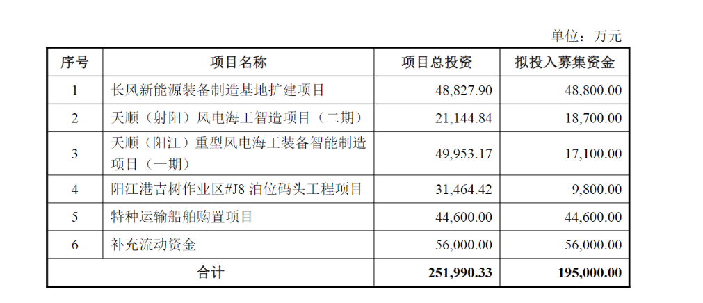 12月13日,天顺风能(002531.SZ)披露2025年度向特定对象发行A股股票预案,募集资金总额不超过19.5亿元,扣除发行费用后将全部用于长风新能源装备制造基地扩建项目、天顺(射阳)风电海工智造项目(二期)、天顺(阳江)重型风电海工装备智能制造项目(一期)、阳江港吉树作业区#J8泊位码头工程项目、特种运输船舶购置项目、补充流动资金。