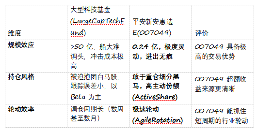 结论:大型基金往往受限于“双十规定”和流动性,只能“躺平”赚赛道的钱;而007049利用其规模优势,赚取的是交易和认知的钱。