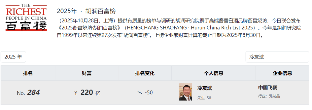 东方财富网显示,中国飞鹤董事长冷友斌持有公司49.38%的权益股份,按此计算,冷友斌可分到公司大部分分红。《2025年·胡润百富榜》显示,冷友斌个人财富220亿元,位列榜单第284位。